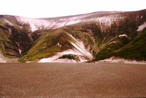 From my dropoff point you can look down on the Valley of 10,000 Smokes, which isn't all that impressive from there. The Valley is fifteen plus miles long and four miles wide. It looks to be a desert-like ash field with occasional blowing sand (ash, really). This is framed on one side by the Buttress Range, a series of low mountains as high as 3500 feet. The Valley floor is at 1100 feet at the base and 2000 feet at the top. On the other side of the Valley is Mount Griggs (7600+ feet), what is left of Mount Katmai (at one time a rival of Mount Griggs in height, now only 5000 feet at its highest), Baked and Broken Mountains (two scorched-earth hills of 3700 feet or so), and a few other mountains. At the far end of the Valley lie Mount Mageik (on the Buttress Range side) and Mount Trident, both active volcanoes which release steam at times. Novarupta, the source of the desolation, lies between Baked Mountain, Mount Katmai, and Trident Mountain.