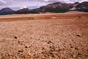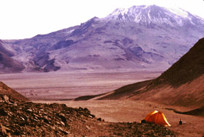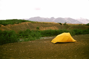 On the opposite side of Windy Creek, the trail resumes. I emerge from a gully with a white chalk line. The trail winds through the ash field for several miles, passing occasional drainages with shrub willow growing along them. A few of these drainages even have surface water. Between drainages all is dead (though again, compared to what comes later, the few tufts of grass here make it bursting with life). About three miles out I pass a tent. This I assume to be three-mile camp (a designation arbitrarily given to a spot roughly three miles (beeline distance) from the Lookout). It is closer to four miles to this point.