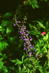 Rejoining the trail does not obviously make the going easier. To the contrary, the willow is joined by cottonwood, both of which seem expressly planted to impede progress. I fight my way through it, getting covering in moisture by the bushes. The sky is tenuous, but holding. I do encounter one plant which holds a jewel of water at the base of each fan of leaves. Flowers also begin to appear, lupens and species I am not familiar with.