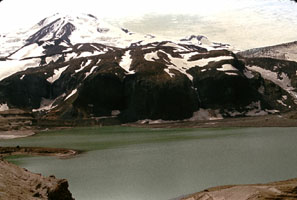 Again, my distance perception is playing tricks. What I now have assumed to be hours away is quickly growing in size. The Lethe cuts through a high embankment (60 feet or more) in a sharp V. Before long I can hear its rushing murmur. I slog through ankle deep sands, then walk across a hard plain of shattered black rock. In fifteen minutes I have climbed up the embankment and stand surveying Mageik Lakes.