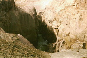 Shortly after passing this point, the trail is squeezed in between the sharp sides of the Buttress Range and the chasm which holds the River Lethe. The River Lethe is an awesome spectacle. Although no gullies channel water to it, it still receives a significant quantity of ash-silt laden water. These pour from the cliffsides into its 200-foot deep chasm, where the river runs in sharp torrents. I am pleased I have chosen not to cross it.
