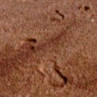 The hike back is much the same as the hike in. I now have a better idea of scale, so it is not as disturbing that a feature I can see clearly takes two plus hours to reach. The sulfur smells increase, and I can see a dust storm developing on the other side of the river, the dust rising into the air several hundred feet. At times I follow the same path I hiked in on. My footprints range from lunar-perfect to completely obscured by the blowing wind. In places the ground was too hard to leave prints, but in others they have simply been erased. To avoid an incoming dust storm and to refill my water canisters, I hike up into the same drainage in which I camped last night.