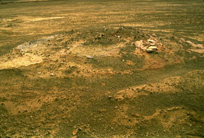 Today I hike down from the hill sides toward the river. The going seems easiest about 1/2 mile from the vegetation (what little there remains of it). Any lower, and I must hike over large mogul-like sand hills. Any higher, and I must climb in and out of drainages. For the last few miles yesterday and for all of today, I keep passing circular patches of harder mineral deposits. Each of these is where one of the 10,000 smokes issued from the ground 80 years ago. Some of them look like they may have interesting colors, but I can not tell. The soil ranges from soft with difficult traction, to harder than is pleasant to walk upon. It is comparatively level, with a gradual grade up toward where I am heading.