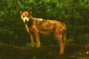 The bus then forded three shallow streams (one fairly wide). Sometime after this the German couple pointed out a wolf. Eventually we alarmed the bus driver enough to stop. I managed to get the correct lens on my camera and the window open in time to actually get a couple of photographs, which I hope came out well. After this we drove by a beaver pond with a huge lodge, then into an area with the first glimpse of the Valley. Here the guide said we could begin to see a brown area (I wasn't sure what area he was talking about).