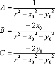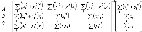 Instead of solving for the linear parameters, A, B, and C, it is more desirable to solve for the values x0, y0, and r using an equation that minimizes the distance from the points to the circle. The following equation is used