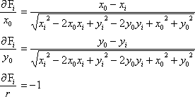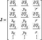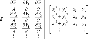Using the equation A(x2+y2)+Bx+Cy=1 with the unknowns A, B, and C, the Jacobian matrix is