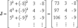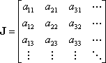 The Jacobian matrix, J, is the matrix of the partial differentials of each equation with respect to each unknown. That is,