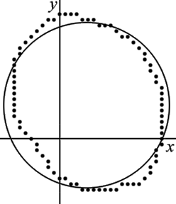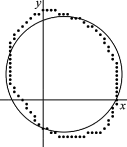 This solution is shown superimposed on the original points in the figure to the right. Note that the circle fits the data points significantly better than the linear solution.