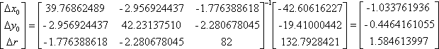 The adjustments of the unknowns, Dx0, Dy0, and Dr, can be solved for using the equation