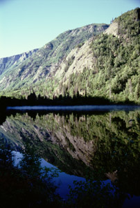 The clouds are gradually lifting, and it hasn't rained in a while. There are hints of great mountains across the valleys. The valleys are full of neatly contrasted pines and alders; the pines are dark and the alders pale. It may be a fall thing; I don't know.