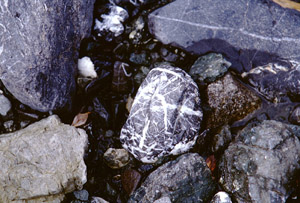 The rocks varied immensely from place to place. In Dixie Pass, they were generally fist-sized or smaller and highly striated and crossed, with plenty of large boulders of similar demeanor. At higher elevations the rocks were more homogenous. In McCarthy-Kennecott, the rocks were often two-toned, dark basalt and light limestone. Along the Nebesna Road the rocks were granite-like in appearance, much like the higher elevations of Dixie Pass. There were also slate-like and slickrock (the most surprising), and volcanic rock [vitriolic basalt].