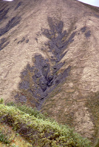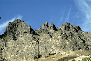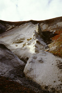After looking around, I descend a steeper way. Across the southern valley (the drainage I came up) I can see some neat rock formations. I angle downwards, tango with some alder, and am splashing in the stream once more. I cut over to the next drainage and follow it until it enters a shale-like rock formations. I take some photographs, but don't proceed too far into the rock canyon, as I would like to get to Palmer before dark (see later comments).