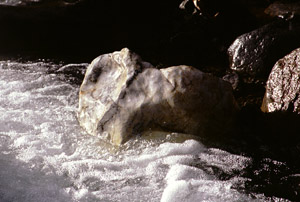 The water is almost ice cold - the result of glacial runoff - but is not too severe. I cross the stream and find a curious white substance. There is a sulphurous smell and a minor trickle of water has strange white strands waving in the current. It looks a little like poached egg whites. In a still pool, it looks more like a white powder. Strange.