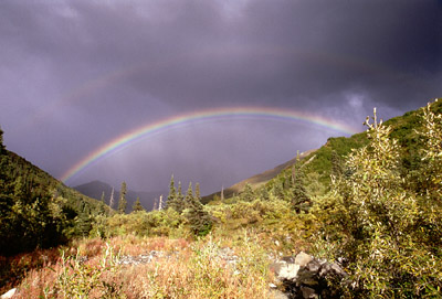 When I finish eating, I climb out of my tent to deal with the dirty dishes. I thought I had a good view from my campsite before - I was mistaken. A stunning rainbow - four distinct bands - arcs perfectly over the mountains. A secondary bow is even visible. Still raining. I grab my camera and burn half a roll of film. [As an aside, the stars visible at Lane Cove, Isle Royale, were every bit as impressive, but in a completely different manner.]