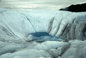 I see a small waterfall rushing headlong into a complex crevasse. I see a pretty little pool. The ice is full of interesting striations formed by rock powder. The cloud deck lifts slightly.